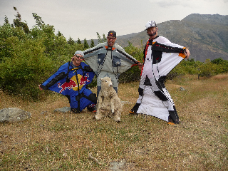 So with 3 jumps and 2 new objects opened in Fiordland and a bad weather forecasted we got in our rented RV and headed back to Chuck’s house near Queenstown to regroup for the next plan, plan C, which turned out to be an A! I’ll get to that shortly. Annoyed with the blasting wind while hanging out at Chuck’s house we put on our wingsuits and ran around in the field chasing sheep. We eventually caught one, well Chuck did anyway, and we got some nice pictures with the sheep. Can’t show you all those though, they’re X rated. The next day the weather cleared and we headed to the drop zone for a little wingsuit skydiving. We did 4 jumps from the Porter above the little town of Glenorchy and Lake Wakatipu. I flew the camera and wore my Pro Fly and got some nice video of Miles and Chuck flying together above the lake and the mountains. As we were landing on our 4th jump we noticed a heli had arrived at the dropzone. It turns out the TV show 20/20 in New Zealand had agreed to pay for some more heli time so they could film us! We, of course, couldn’t disappoint them! Ooh! Ooh! My arm hurts! Stop twisting it! Ok Ok! We’ll go do some sweet base jumps off some more new cliffs for you on your dime! We threw all our skydiving gear in the van and piled all our base gear into the heli and rallied up to another amazing place near Mt. Earnslaw.