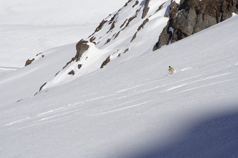 The nine-day itinerary includes five full days of training and two free ski days. Trainers break the crew into groups based on ability and goals on the first afternoon. Members of the top group, led by Chris Fellows, are instructors and instructor trainers, many of whom are preparing for the 2008 National Instructor Tryouts at Snowbird. I team up with them and their collective ski ability is astounding as we dive right into technical drills. Putting image aside, we “dolphin” across the slope, lifting our ski tails off the snow and landing on our tips repeatedly, to feel balanced fore and aft motion in our lower legs. Starting on groomers, we soon veer off-piste to apply our skills. We lap the Roca Jack lift – a five-person Poma that speeds up the same steep slope where Michel Prufer set a 134.5 mph speed skiing world record in 1987.